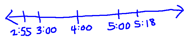 Let’s say you have a problem like this: A train departs at 2:55 and arrives at 5:18. How long is the train ride?
